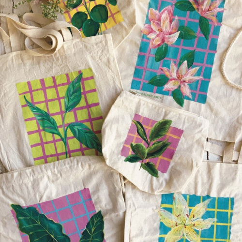 Tote bags y cartucheras pintadas a mano y con estampas hechas con xilografía ✨