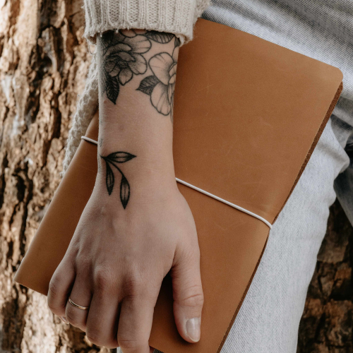 Cuaderno de cuero con elásticos tamaño Original (11x21cm aprox.), viene con dos cuadernillos a elección