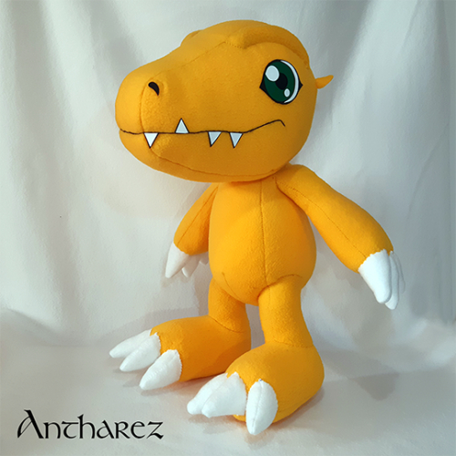 Personaje: Agumon Serie/juego: Digimon Mide: 55cm Cosido a mano, tela polar, vinilo, vellon siliconado, perlas de telgopor y realizado a escala.