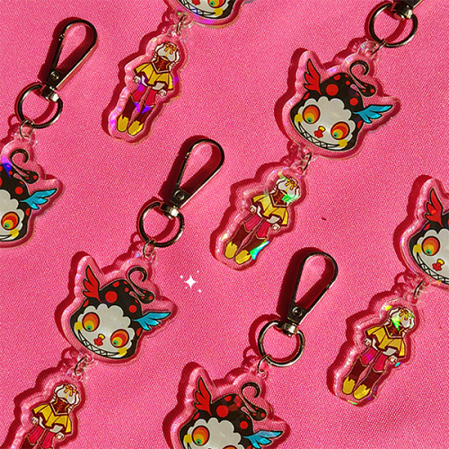 Llavero de doble dije de acrilico holografico de 3mm con impresión bifaz UV y mosquetón de niquel.