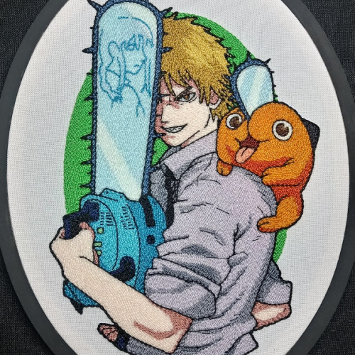 Bordado en tecnica de punchneedle, de Deku y Pochita, el anime Chainsaw man