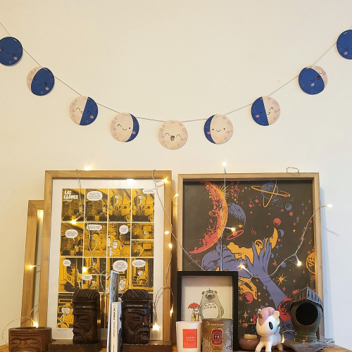 Guirnalda con 9 lunas (diámtro de 9cm c/u) con las fases de la luna.