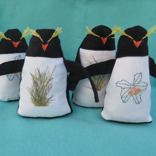 Interpretación textil del pingüino de penacho amarillo. Confección y relleno con telas recuperadas de taller, detalles del cuerpo y flora asociada a su ambiente bordados a mano.
