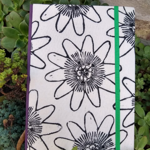Encuadernación artesanal linograbada con diseño de flor de Mburucuyá. Acercando la flora nativa de argentina a nuestra cotidianidad.