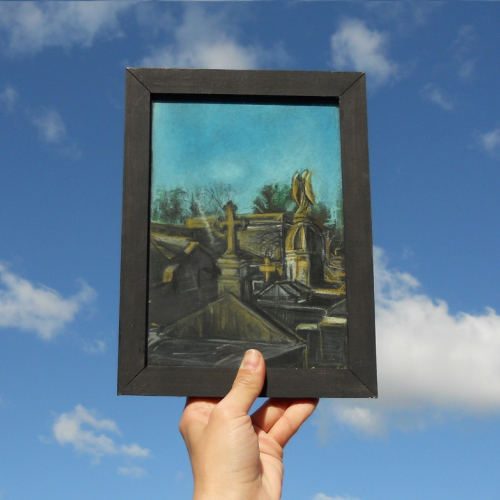 Una vista elevada del cementerio a tiza pastel sobre papel negro, 2020. 20 x 14 cm Enmarcado