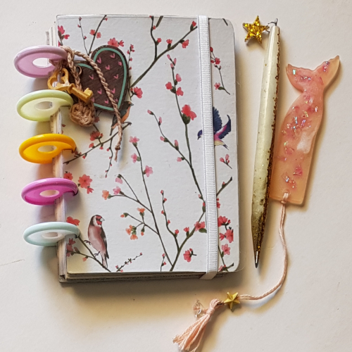 Cuaderno 60 hojas A6,sistema de discos, pueden ser con mix de hojas punteadas, lisas y rayadas o en presentación de 1 solo tipo de hoja. Los accesorios de resina birome y marcapaginas) son a modo de decoración y disponibles aparte.