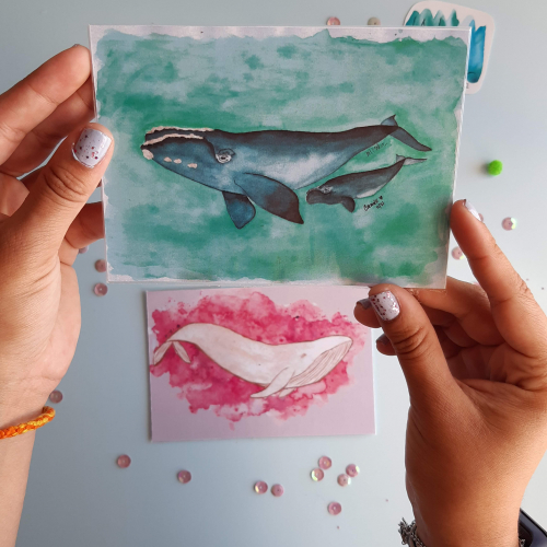 Ilustración realizada en acuarela, diseños propios. Tiene un tamaño postal, de 15x10cm aprox.