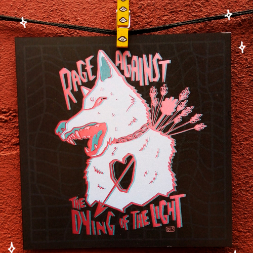 Print impresa en papel ilustración mate de 300gr Doblefaz, con fragmento del poema "Do not go gentle into that good night" de Dylan Thomas en su idioma original y traducido al español. Medidas: 13x13cm