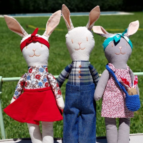 Conejos blancos y grises. Podes encontrarlos con diferentes looks. También podes agregarles un conejito bebé en su cartera.