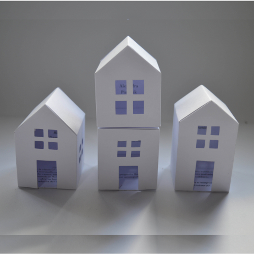 Barrio de poetas argentinas Set de cuatro casas para armar. Cada casa tiene una poesía en su interior que se espía por puertas y ventanas. Viene con dos librillos: uno con las poesías y otro con las instrucciones para el armado. Medidas aprox de las casas: 8x5 cm cada una