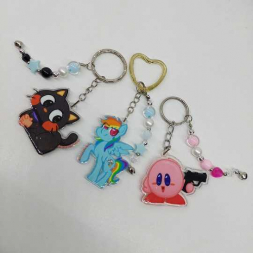 Llaveros de acrilico impresos en doble faz con diseños propios (variados) el tamaño puedo variar entre 5 o 7 cm por diseño, reforzados con resina. Pueden variar los colores y diseños de los cierres mosquetones. Los charms tienen 3cm aprox.