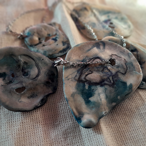 Piezas marinas intervenidas en cianotipia y transformadas en amuletos con propósito.