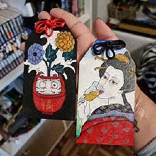 Los omamoris son talismanes o amuletos de protección y buena suerte. Se deben llevar con unx mismx (como un llavero) o colgarlos cerca de una puerta. Son de fibrofácil de 7x13 cm, pintados a mano y con el nudo tradicional.