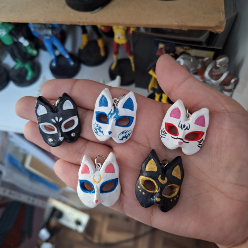 Mascaritas de porcelana fría, esculpidas y pintadas a mano. Pueden ser llavero o collar.
