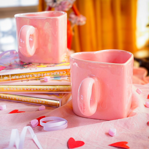 taza con forma de corazón pintada enteramente con esmalte rosa
