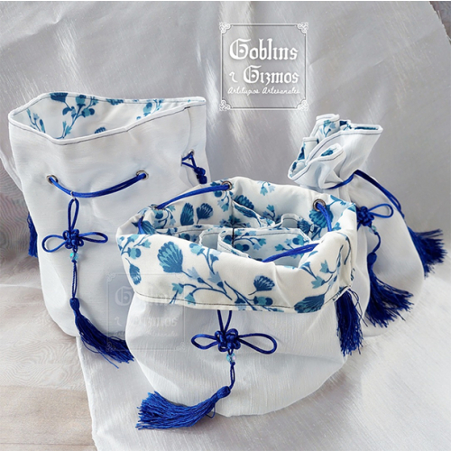 Bolsas para dados de 20x25cm, con 6 bolsillos para separar tus dados! Esta colección tiene la temática "porcelana" y es en tonos de blanco y azul pero tenemos muchos otros modelos disponibles, y hacemos bolsas personalizadas!