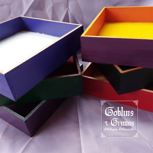 Bandejitas de 20x20 pintadas con colores y diseños personalizados, con el interior recubierto en una tela felpudita y suave para proteger la bandeja y a tus dados en tiradas fuertes