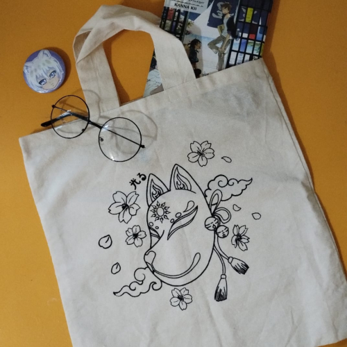 Totebag cuadrada con diseño de una máscara kitsune y flores de cerezo hechos en serigrafía