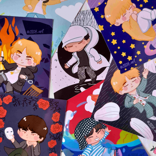 Prints de ilustraciones fanart de kpop variados.