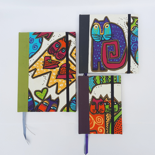 Cuadernos A5, A6 y 1x1, con: - 60 hojas recicladas o bookcel, rayadas o cuadriculadas; - tapa dura entelada; - elástico; y - 2 cintitas señaladoras.