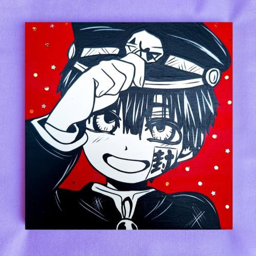 Pintado a mano con pinturas acrílicas y brillos. De 17x17cm con gancho para colgar.