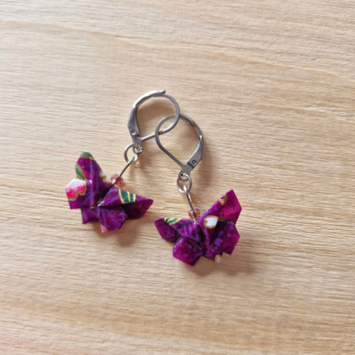 Delicadas mariposas plegadas en papel chiyogami y protegidas con resina. Quedan muy resistentes y brillantes. Decoradas con cristales al tono y ganchitos tipo brizura de acero quirúrgico.