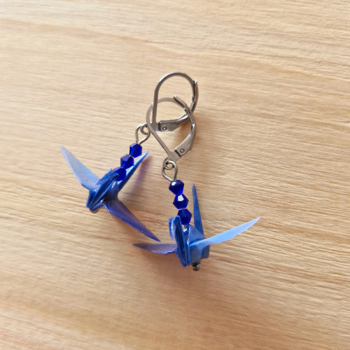 Clásicas grullas plegadas en papel protegidas con resina. Quedan muy resistentes y brillantes. Decoradas con cristales al tono y ganchitos tipo brizura de acero quirúrgico.