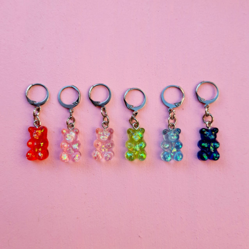 aritos de ositos de gomitas , disponibles en toda esa variedad de colores , aros plateados.