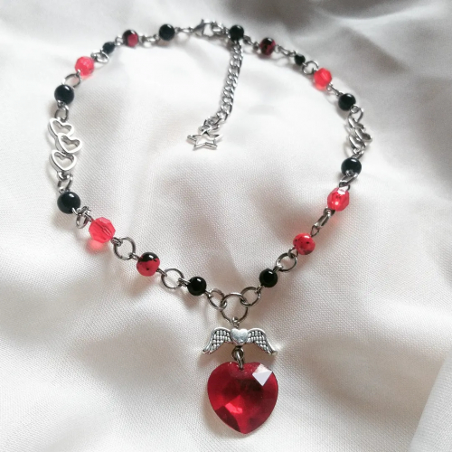 Collar cupido, realizado con perlas negras, rojas y plástico facetado, (por el momento solo viene en rojo), 31cm de largo + 8 cm de cadena ajustable, con un detalle de una estrella.