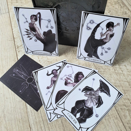 Carta tamaño postal 14cm x 10 cm doble faz: Zodíaco Negro. Venta por unidad o juego de 13 signos, incluyendo a Ofiuco.