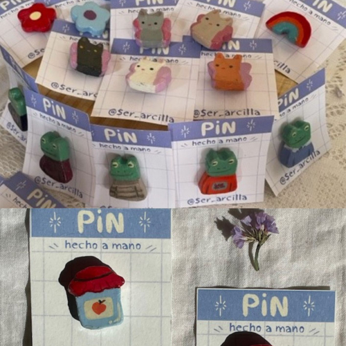 Pins de arcilla varios. Diseños únicos ya que están hechos a mano ^^ Diseños: florcitas, gatitos haditas, calcifer, kaonashi. ranitas, arcoiris, honguitos, entre otros.