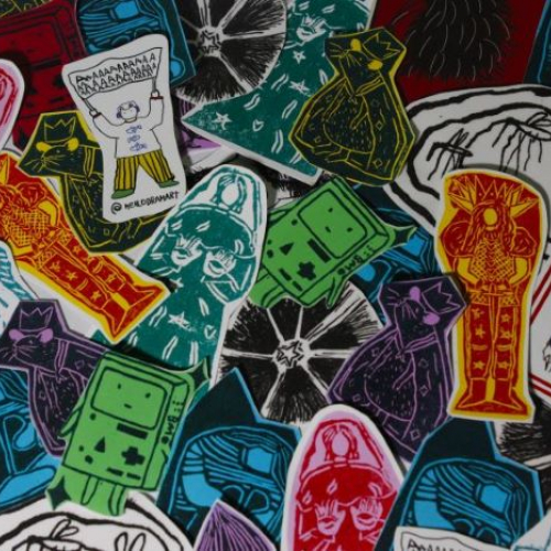 Stickers de mis ilustraciones digitales, talladas en madera y dibujadas a mano en distintos papeles adhesivos: glitter, metalizado, plastificado