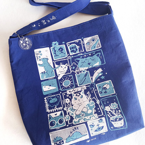 Bolso de gabardina azul impreso en serigrafía a dos colores. Tamaño:37x40 cm