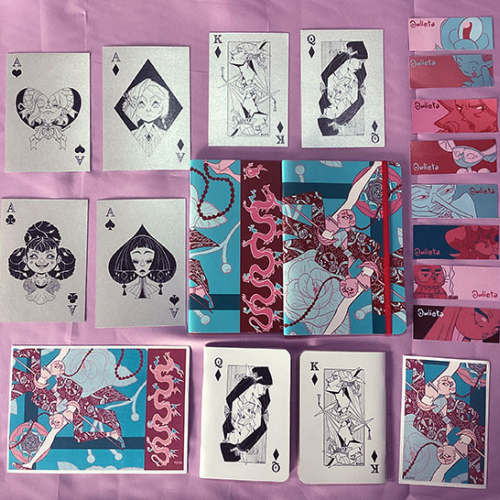 Cuadernos A6: Reyes de diamantes Hojas redondeadas, papel ecológico, liso Cuadernos A5: Espadachin. Hojas redondeadas, papel ecológico, liso Prints (A6): Papel gris perlado. Cartas varias Prints: Espadachin A6 y A5
