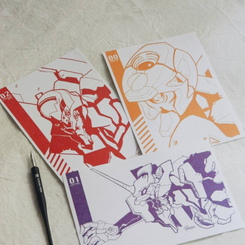 Ilustraciones de las tres principales Eva de la serie Evangelion. Vienen en tamaño A5.