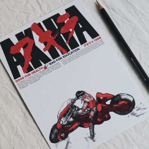 Ilustración de Akira estilo poster. Impresión disponible en tamaño A5. También hay stickers de Kaneda con la moto!