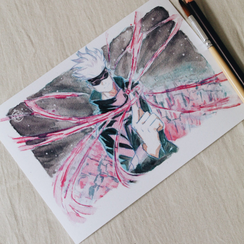 Impresión de Gojo Satoru del anime Jujutsu Kaisen, en papel texturado. Impresión disponible en tamaño A5.