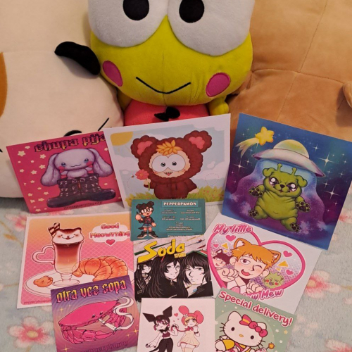 Vienen en tamaño grande y tamaño postal, impresos fullcolor en Opalina gruesa, listos para pegar en tu pared, enmarcar o enviarle por correo a un amigue que tengas lejos ♡