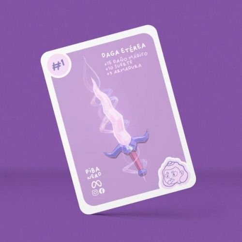 Trading Card #1 Daga Etérea. Viene con instrucciones para poder realizar la experiencia de Realidad Aumentada con la app de Instagram. Impresa en papel autoadhesivo especial 3D eye cat, con efecto tipo holo.