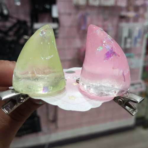 Son hebillas con forma de cuernitos Que brillan en la oscuridad Vienen en colores combinados o de un solo color Son hechos a mano en resina