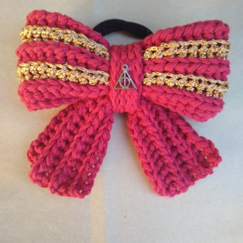 Lazo o colita para pelo con dije reliquias de la muerte. Este moño está confeccionado en algodón 100% lavable. Color y motivo de la casa GRYFFINDOR - Harry Potter.