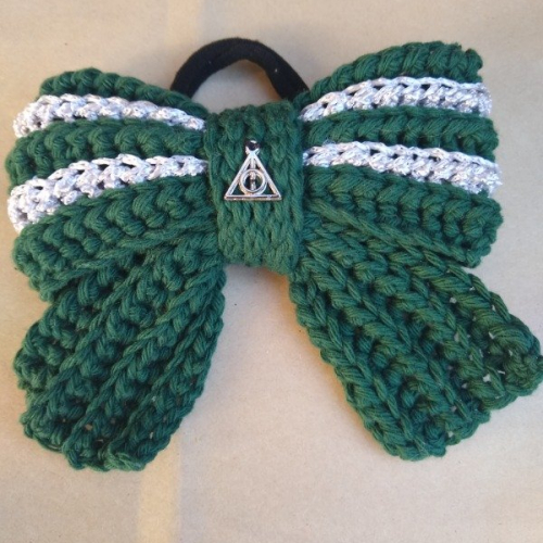 Lazo o colita para pelo con dije reliquias de la muerte. Este moño está confeccionado en algodón 100% lavable. Color y motivo de la casa SLYTHERIN - Harry Potter.