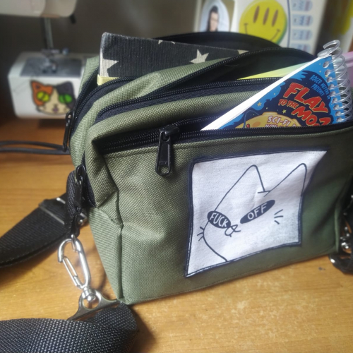 *Material cordura y gabardina. *Dos compartimientos con forreria de gabardina. *Bolsillo con cierre y parches. *Correa regulable.