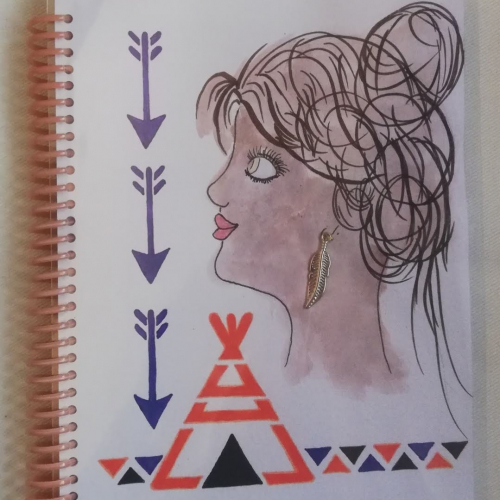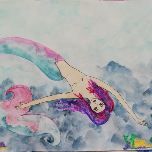 Ilustración sirena con acuarelas tornasol y acrílicos metalizados.