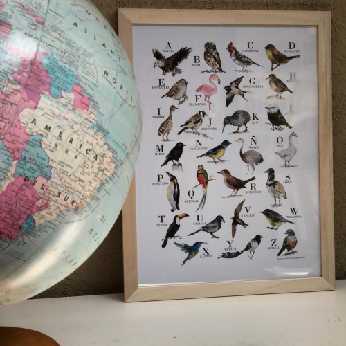AVEcedario 30x40 Abecedario de aves, impreso en opalina 200gr, con marco de madera natural, vidrio y ganchito, listo para colgar. Diseño original Belén Lupo.