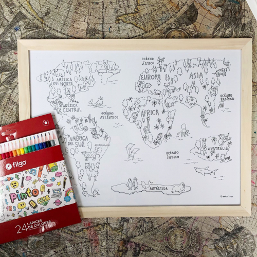 Mamundi para pintar animales del mundo+24 lápices de colores Filgo. Impreso en opalina. Incluye marco de madera natural, vidrio y ganchito para colgar. Diseño original Belén Lupo.