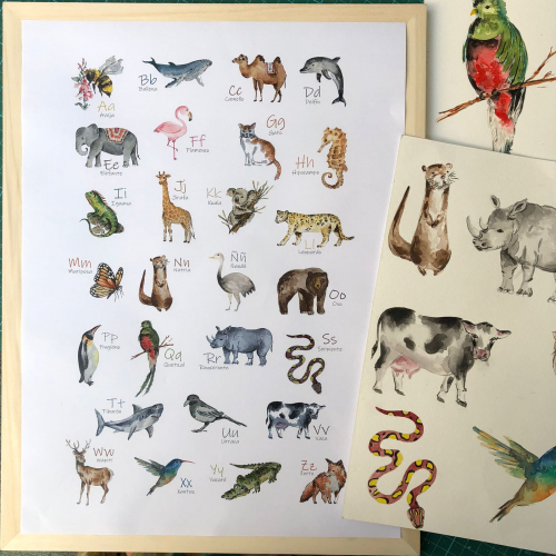 Abecedario animales, impreso en opalina 200gr, con marco de madera natural, vidrio y ganchito, listo para colgar. Diseño original Belén Lupo.