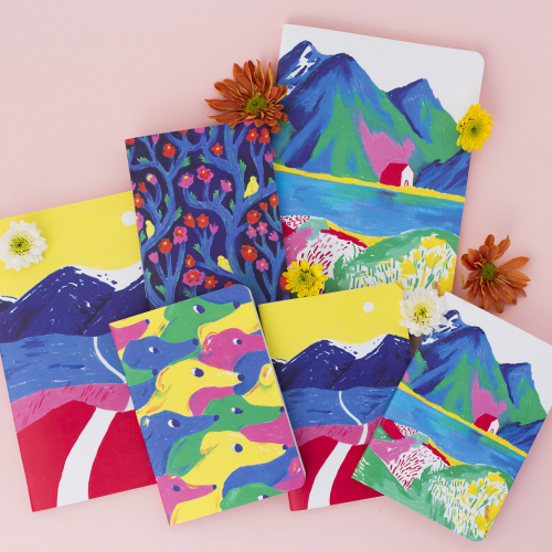 Libretas A6, y libretas A5 (inéditas) Tapas en cartulina ilustración de 300 gr impresas en digital y laminadas mate. Hojas lisas ahuesadas de 80 gr. Puntas redondeadas.