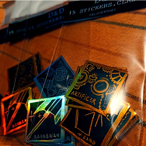 Packs de 15 stickers holográficos con las clases de D&D y extras.
