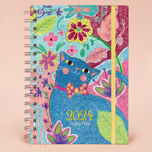 Agenda 2024, semana a la vista, con 12 ilustraciones interiores, y stickers, tapas duras con anillado metálico, elástico, bolsillo interno. Medida 15x21cm